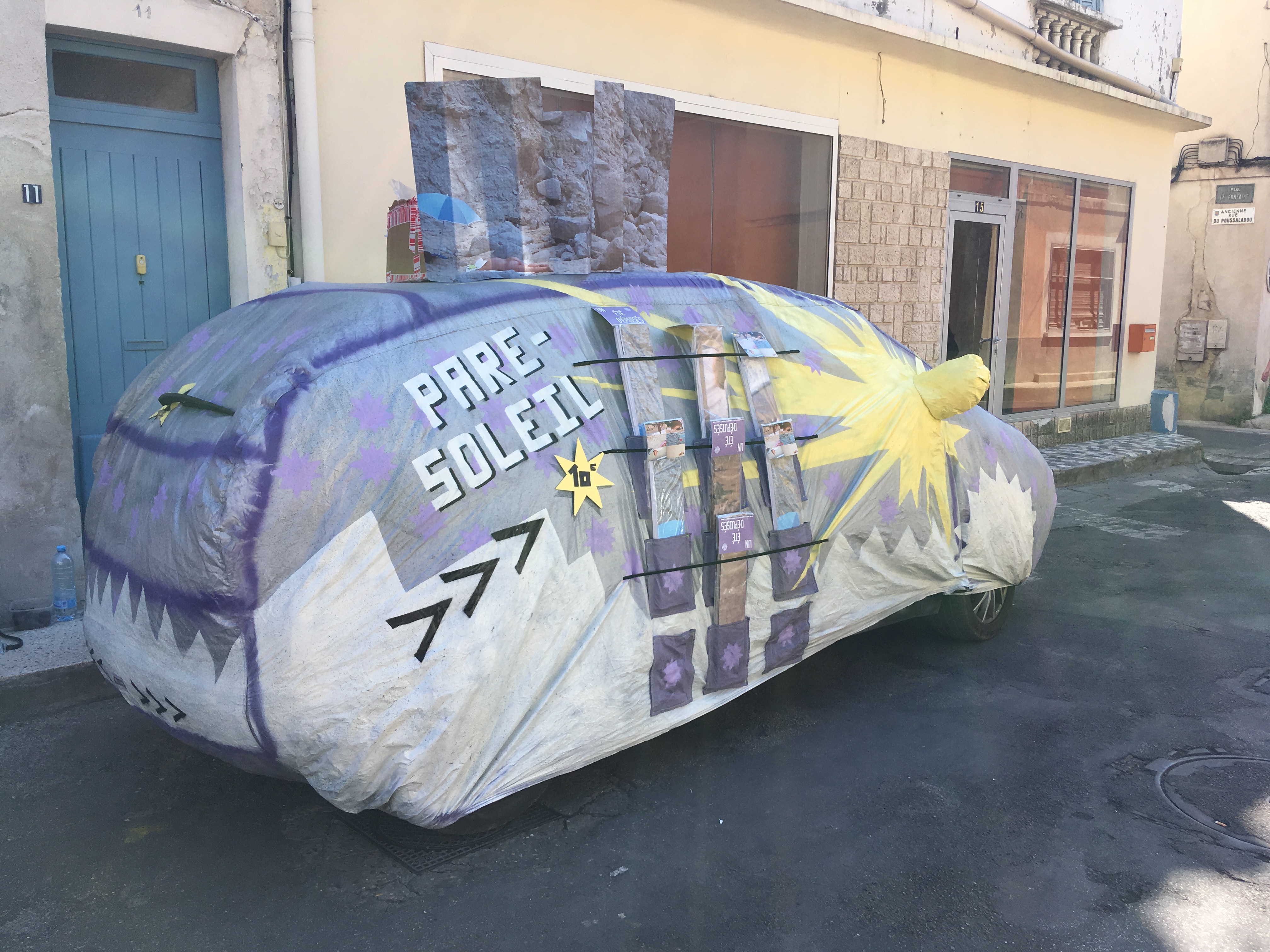 La série des « corps échoués » a investi les pare-brises arlésiens pour s’exposer davantage au soleil pendant les Rencontres Photographiques, Arles, 2018